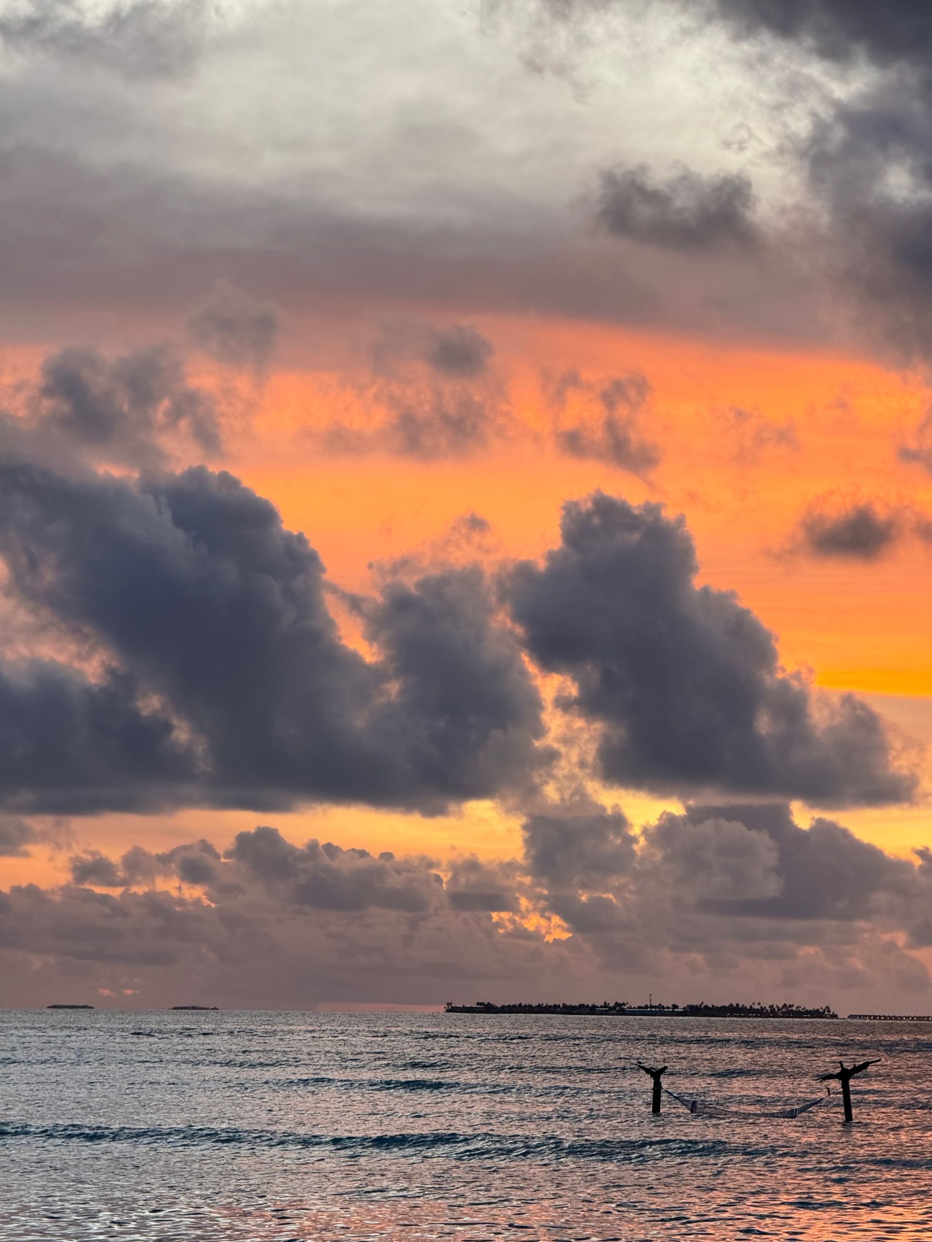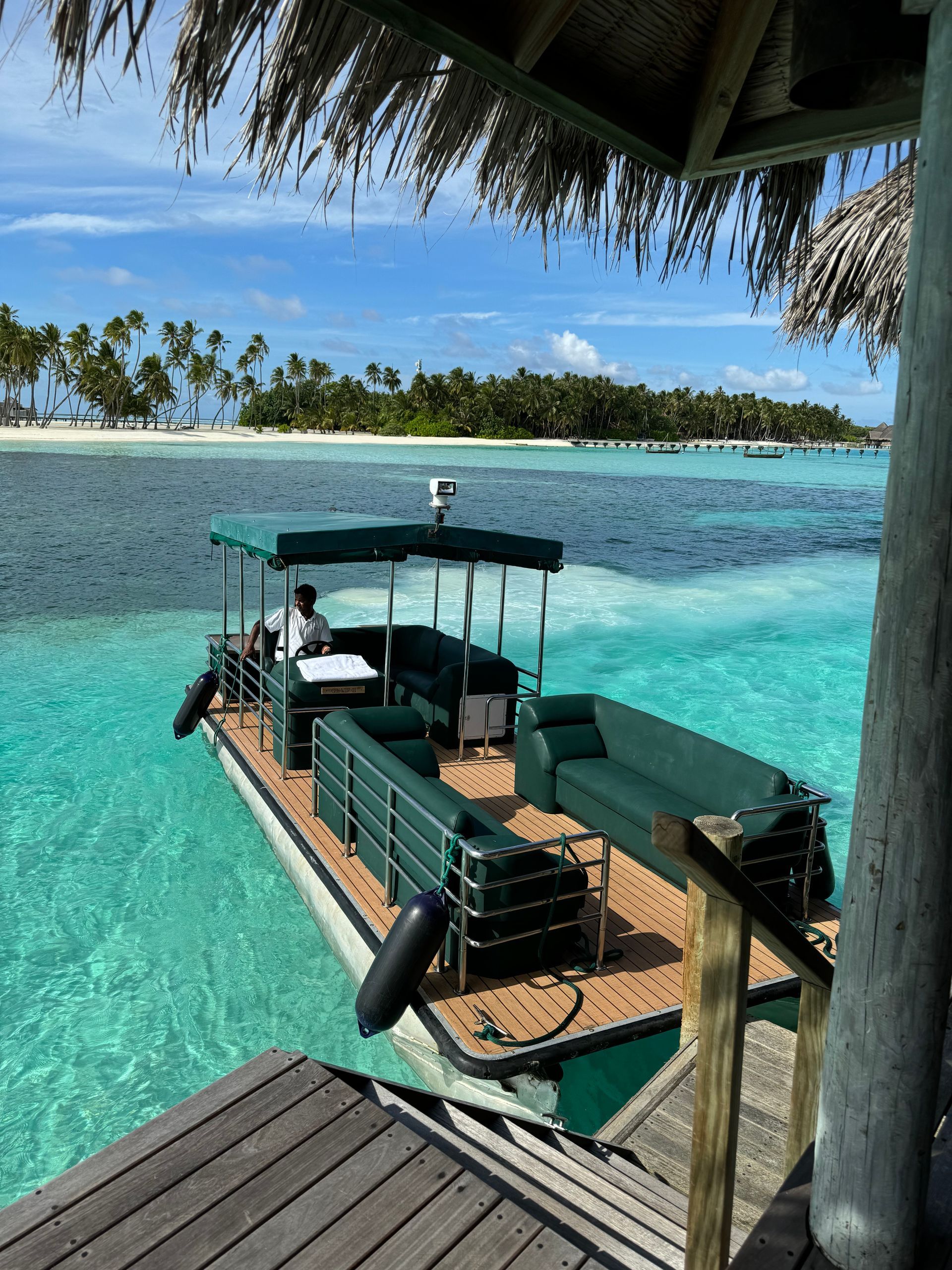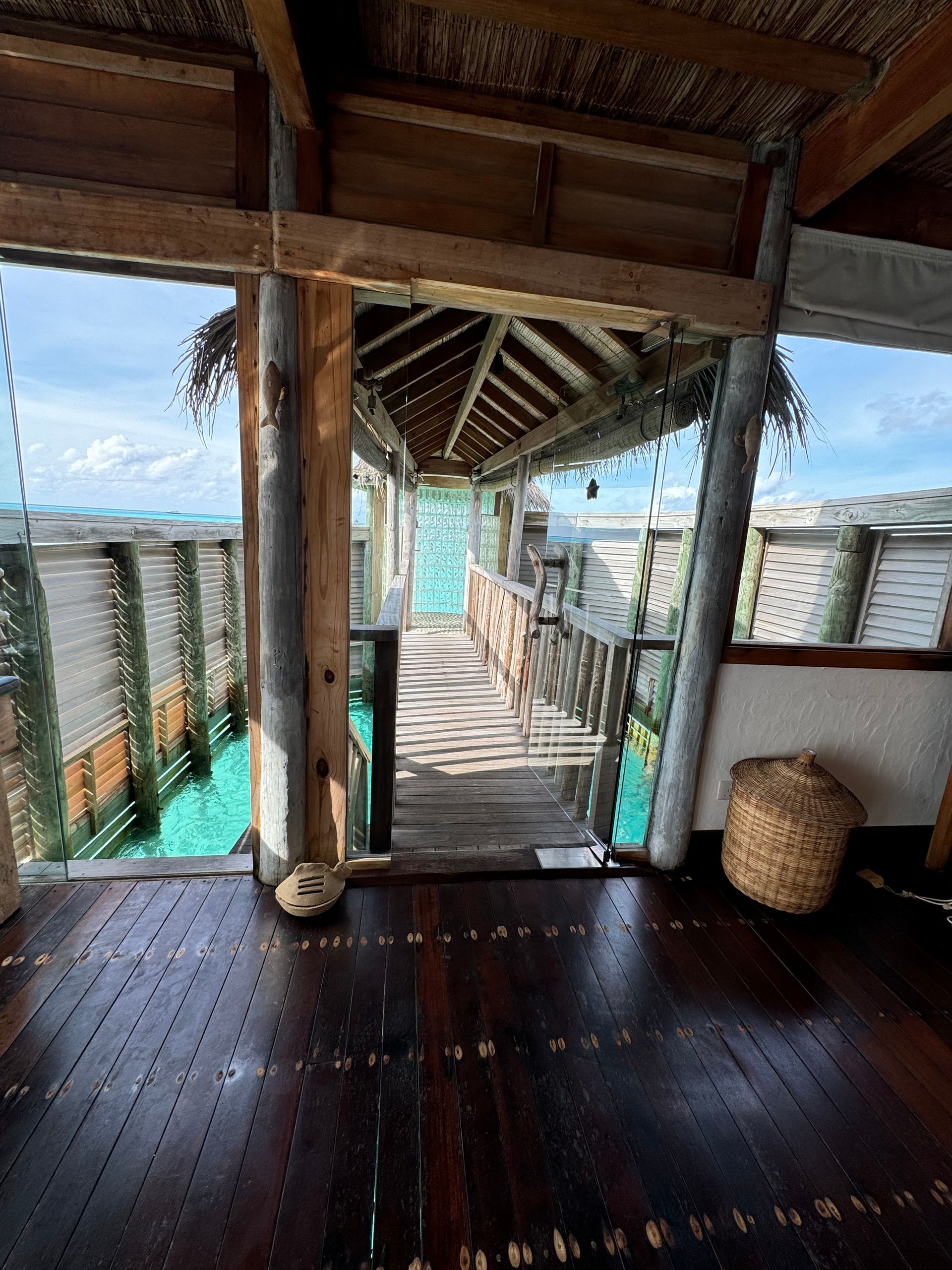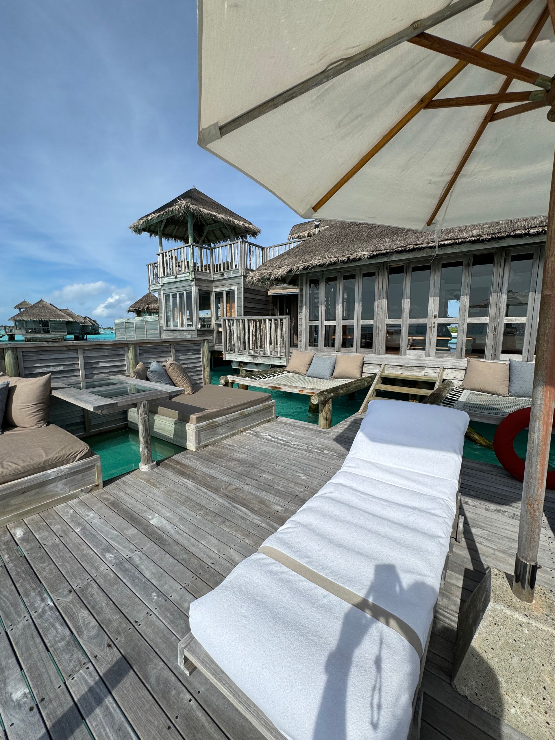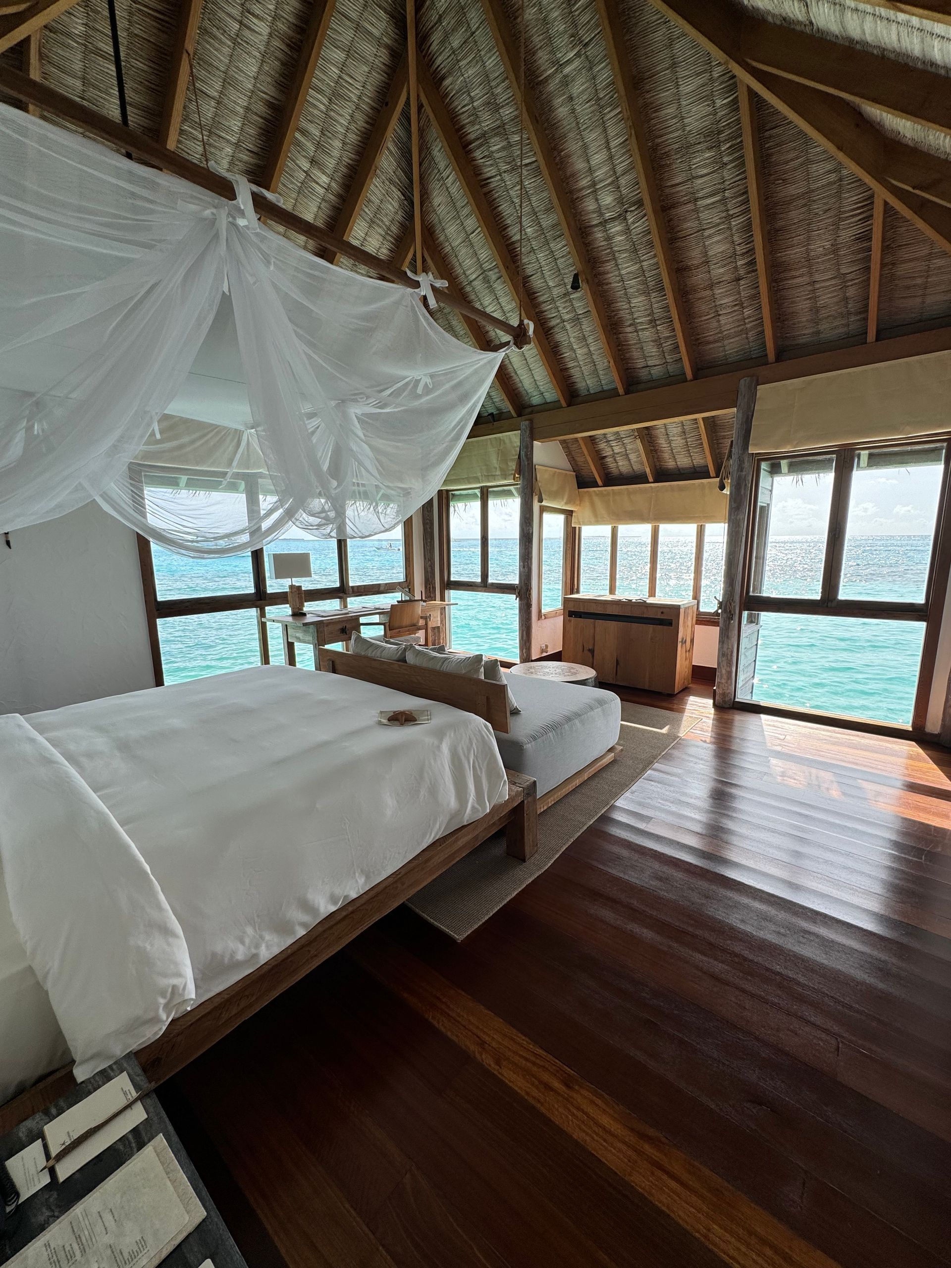 From the moment we arrived, we were immersed in a world where elegance and nature exist in perfect harmony. The resort’s philosophy of “No News, No Shoes” (yes we gave up our shoes on the boat from Male and even went to dinner barefoot one night) instantly set the tone for a laid-back yet refined experience. Our Sunset View Crusoe Residence was beautifully crafted from sustainable materials, offered panoramic ocean views, direct lagoon access, and the kind of privacy that’s hard to find anywhere else, as you can only access these rooms by boat.